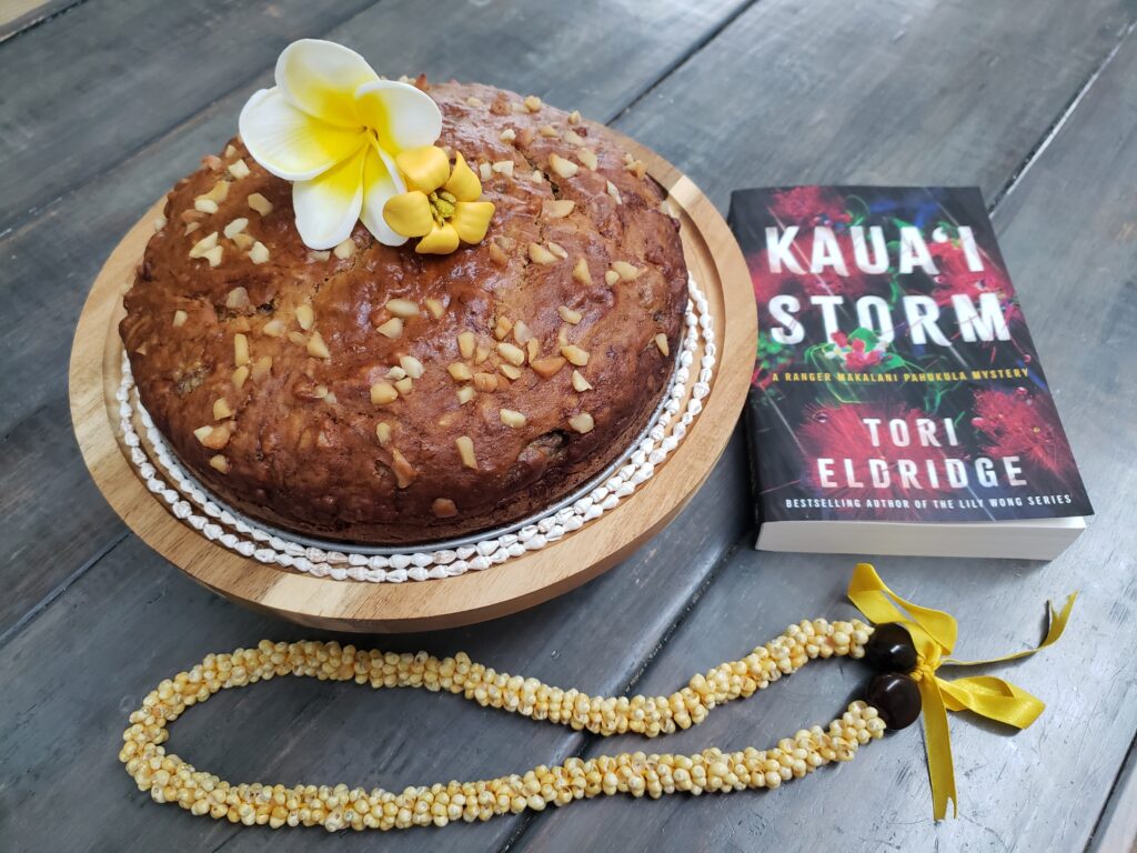 As Ranger Makalani Pahukula hunts for her missing cousins in Kaua‘i Storm, her mother, Julia, prepares loaves of banana macadamia nut bread for her mother-in-law’s birthday lū‘au. Since the macadamia nuts are grown on Tūtū’s homestead, Julia must shell, roast, and smash the nuts by hand. An abundance of mālama (care) and aloha (love) goes into each loaf—not to mention plenny kine nuts! If only Julia could work and laugh alongside her daughter, her ono banana macadamia nut bread would taste three times as good.
