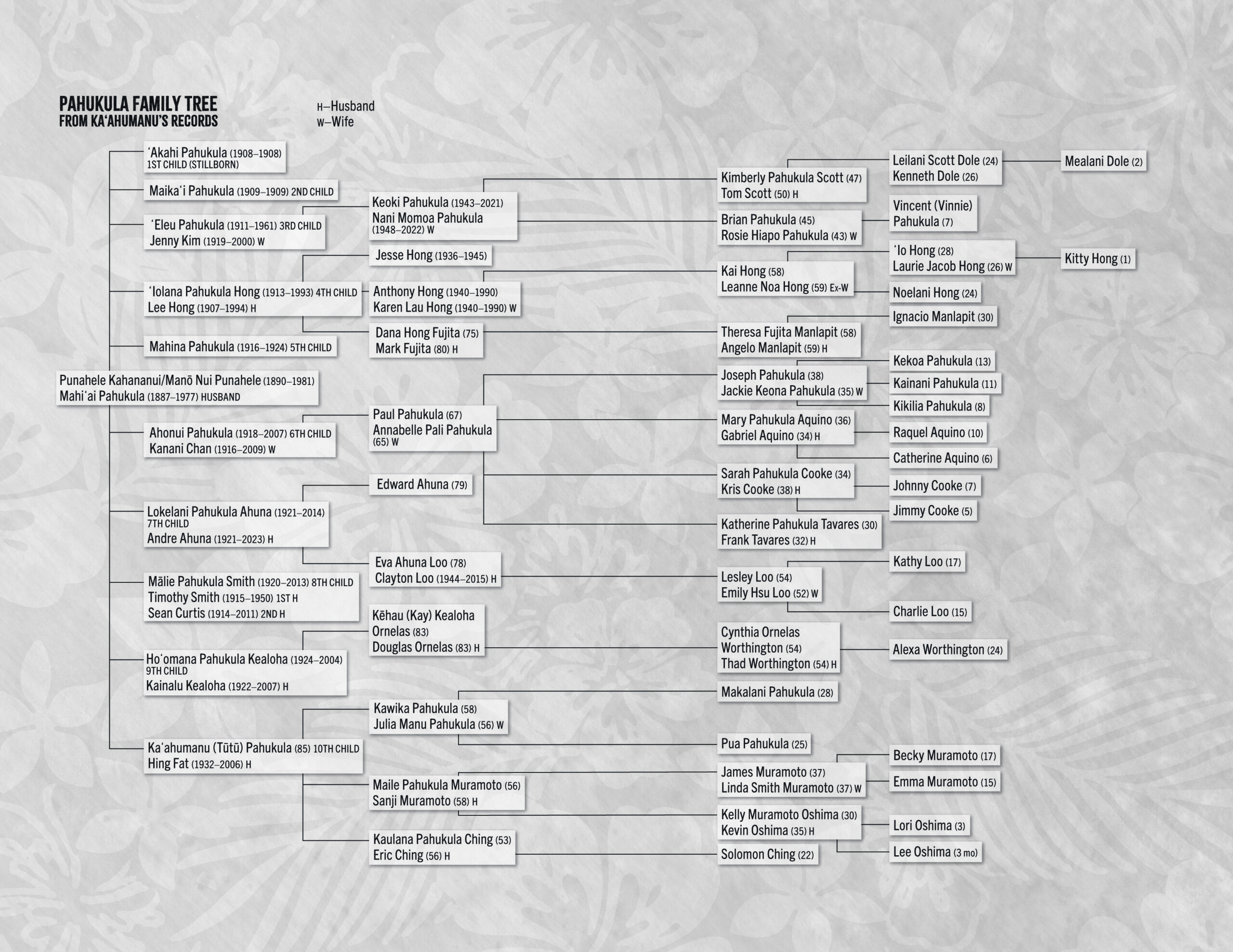 When writing her books, Tori often does a full genealogy of her protagonist and/or her main guest character. What follows is the Pahukula family tree as appears at the front of Kaua‘i Storm. The genealogy Tori created while writing is far more detailed.