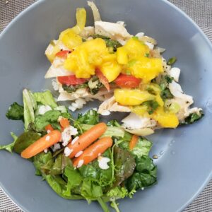 Miso Steam-Baked Cod with Peppers Mango Soy Relish, Yuzu Salad – Inspired by Aunty Maile’s steamed pāpio in Tori Eldridge’s novel, Kaua‘i Storm